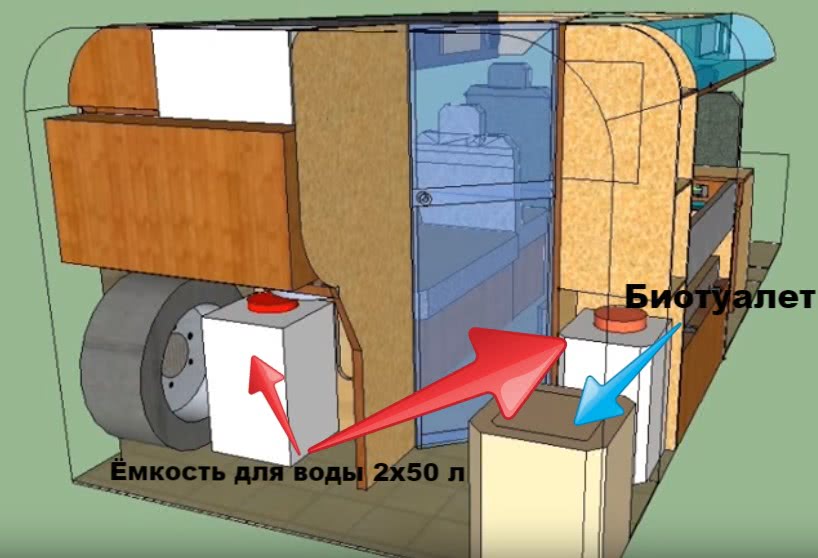 Расположение биотуалета и емкостей для воды
