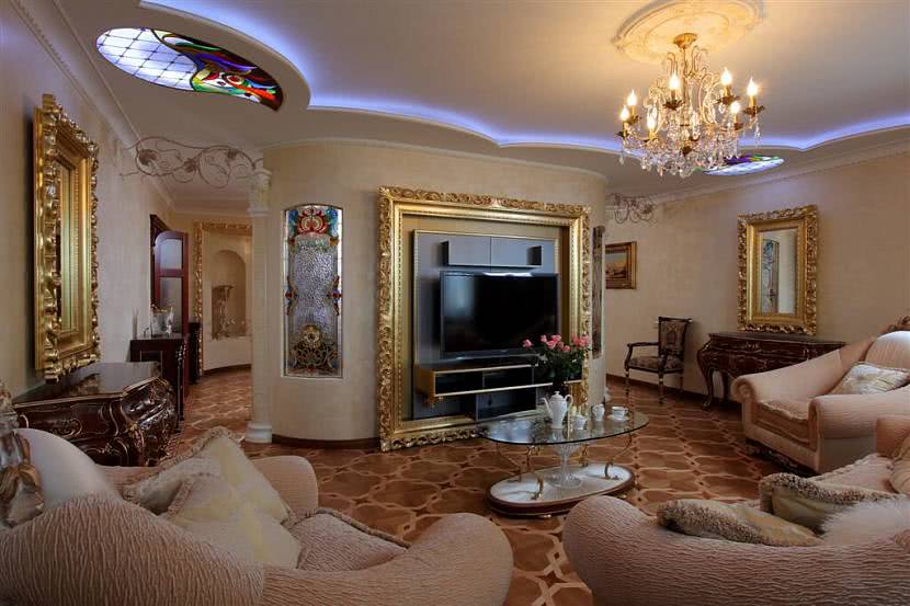 Широкие галтели должны украшать просторные помещения. Габаритные багеты в интерьере маленьких комнат выглядят нелепо, более того, они заметно утяжеляют пространство и представляют его еще более тесным.