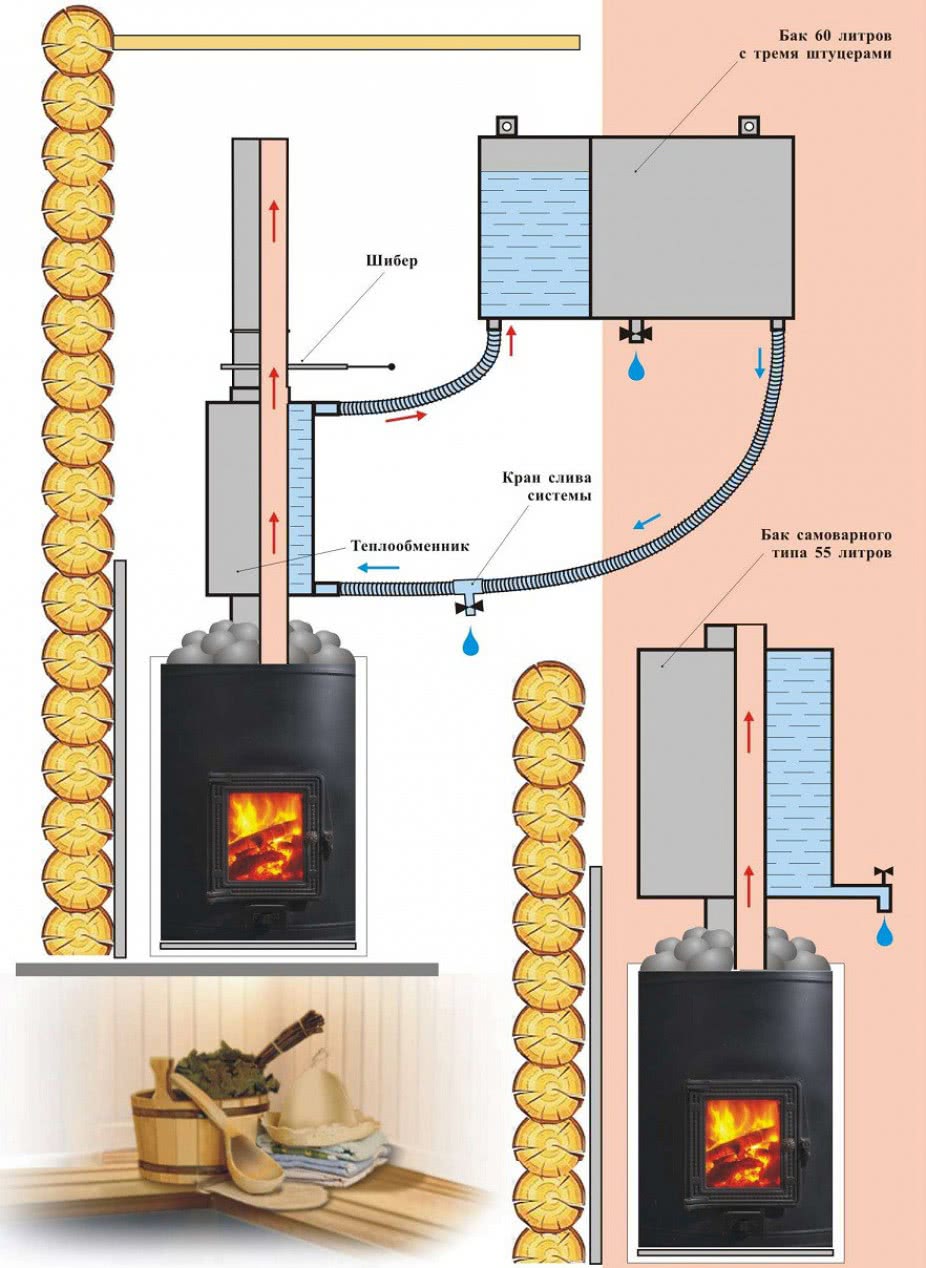 Расположить бак в бане можно в разных вариантах. В основном используются такие разновидности: