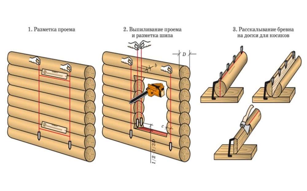 Шаг 1. Сделайте точную разметку оконного проема, пользуйтесь уровнем. Размер оконного проема должен соответствовать коробке и одновременно по высоте иметь запас в несколько сантиметров. Запас должен компенсировать не только усадку сруба, а и его периодические колебания по высоте. Дело в том, что все пиломатериалы в той или иной степени впитывают влагу. Отсыревшие конструкции увеличиваются в размере, а высохшие наоборот, уменьшаются. Процесс этот происходит постоянно, для этого в бане можно и не мыться. Летом сруб усыхает, а сырой осенью увеличивается.