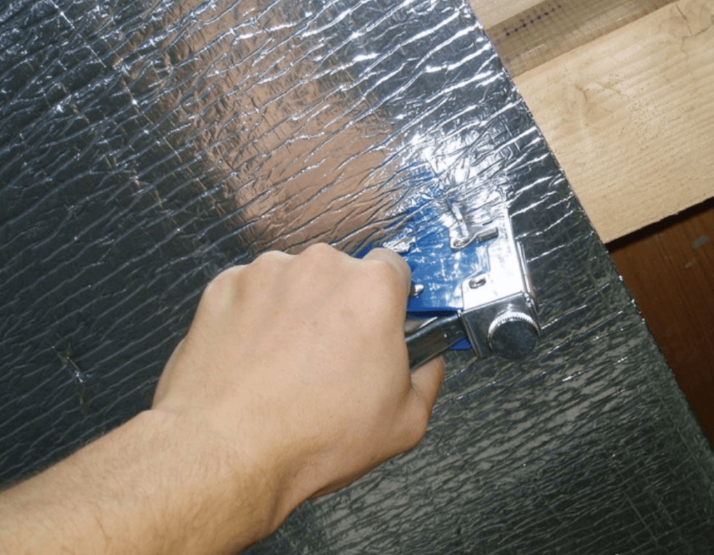 В бане фольгу лучше всего крепить с помощью обыкновенного степлера