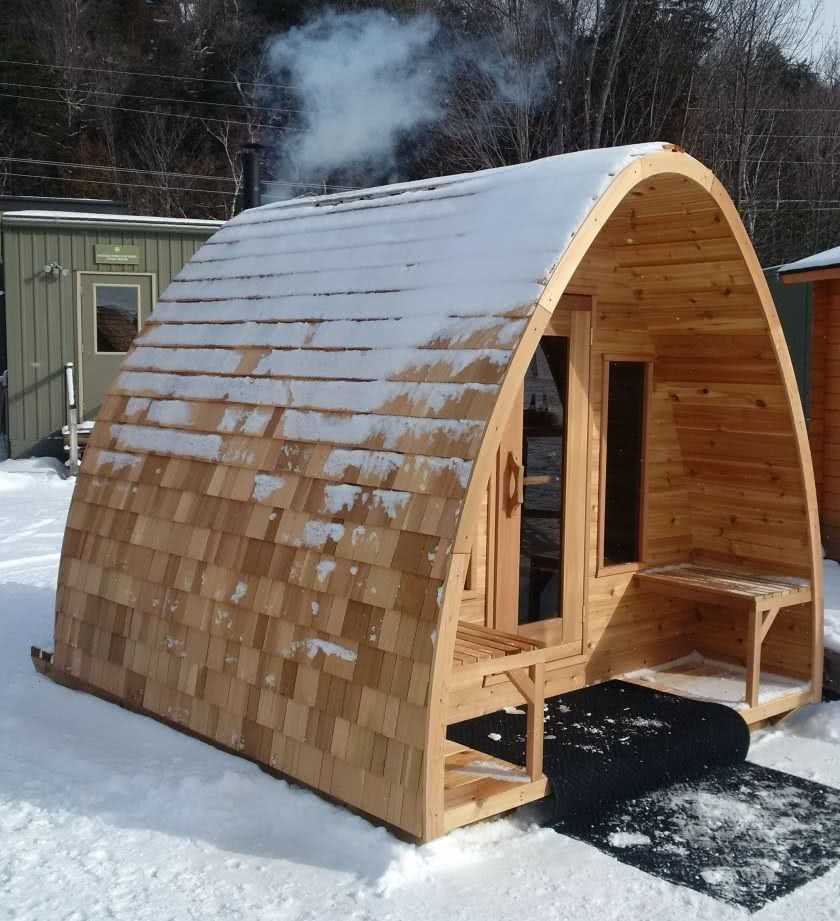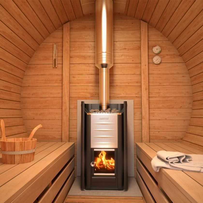 Это самая обычная деревянная бочка, только более солидных размеров. Часть ее перекрывает деревянный решетчатый экран, за которым прячется печь. Перед экраном – небольшая скамья. Париться одновременно в такой бане может даже трое человек. Но этот вариант – только летний: выкатили на участок, поставили горизонтально, забросили дрова в печь и можно лить воду на камни. Но как низкобюджетный вариант – очень даже ничего.