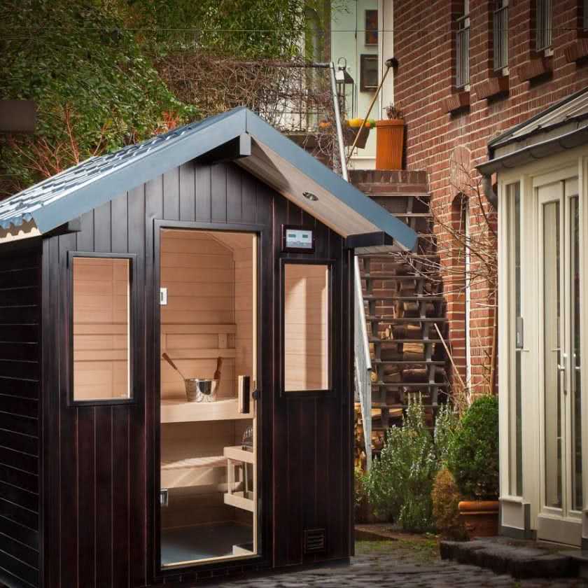 - Мини-вариант из одной парилки располагают рядом с летним душем или оборудуют козырек, где оставляют бочку и ковш для обливания.