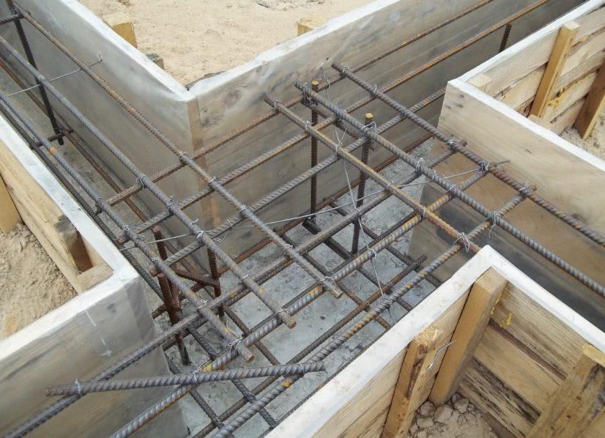 В трубы вставляют каркасы из рифленой арматуры класса А3 и бетонируют, оставляя открытыми верхнюю часть арматурных стержней. Теперь по периметру домика выполняют опалубку из многослойной фанеры для ростверка, в которую вставляют стальные каркасы. После крепления каркасов к стержням опорных столбов всю опалубку заполняют бетонной смесью.