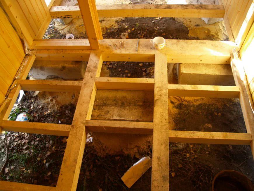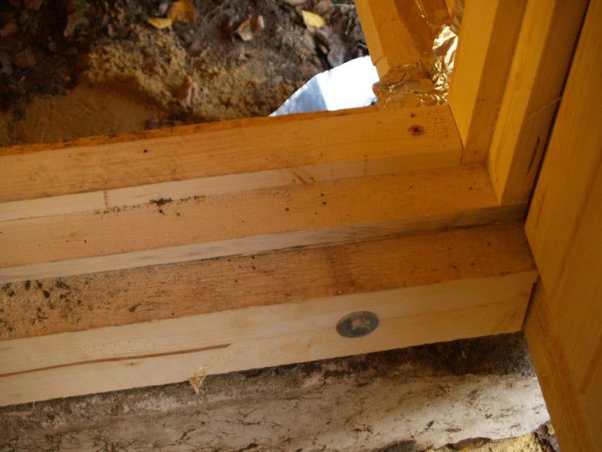 - Каждый из них накрывается гидроизоляцией из рубероида. Затем на фундаменте выполняется обвязка из пропитанного антисептиком бруса.