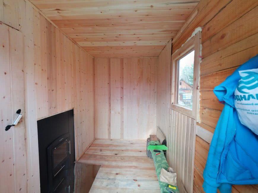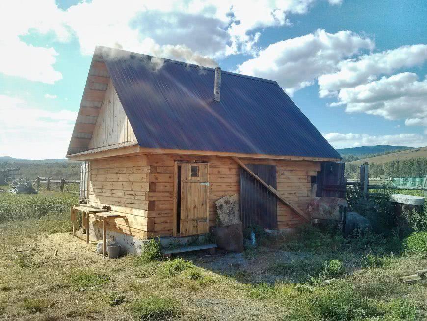 Она состоит из одного парильного отделения. Для помывки владельцу нужно пристроить навес с летним душем или дополнить помещение канализацией, а печку — баком для подогрева воды.