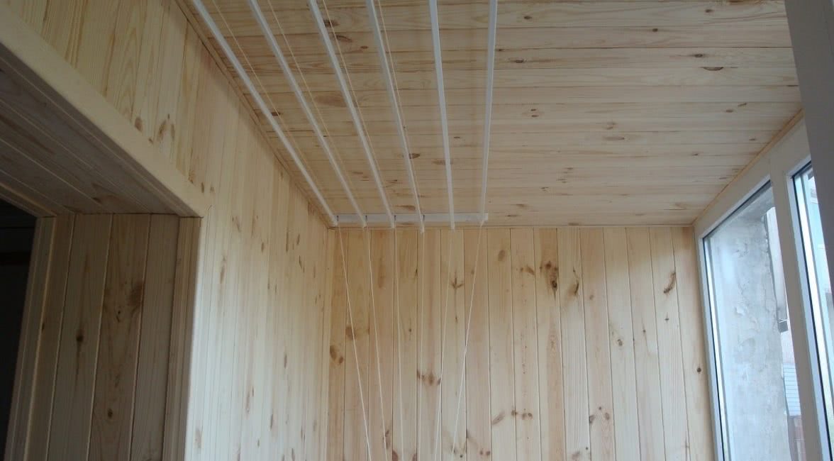 - приспособление делается из каркаса и веревок, которые протягиваются через перекладины, где сушится белье. Штанги можно подтянуть к самому потолку;