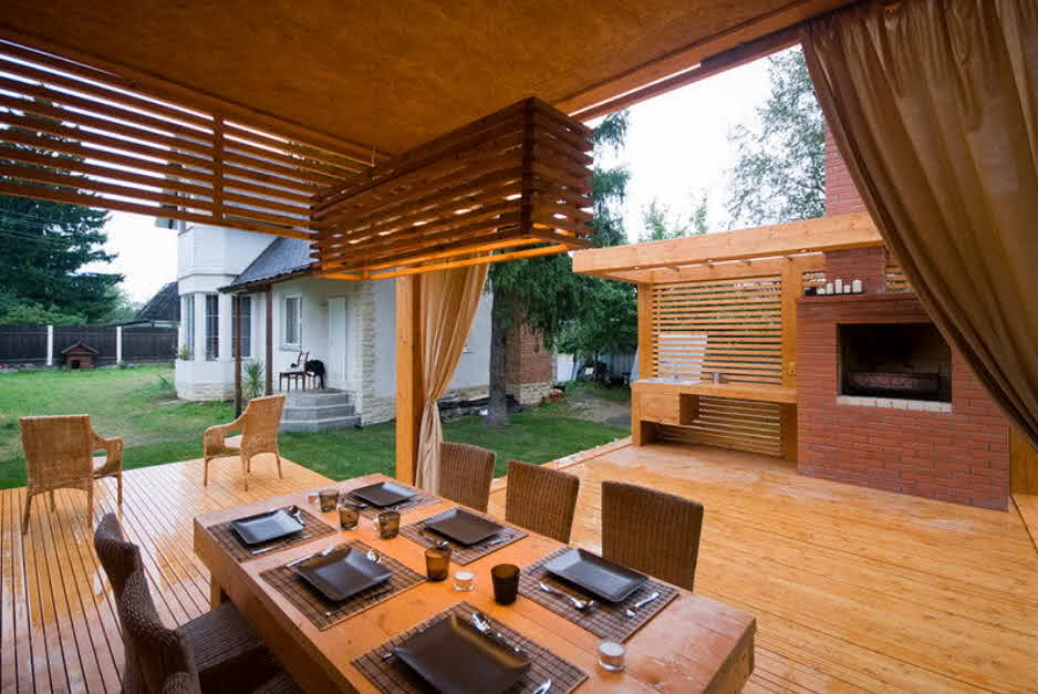 Все зависит от ваших вкусов и финансовых возможностей. Поскольку на даче мы долго находимся на свежем воздухе, открытая конструкция создаст желанную тень и прохладу.
