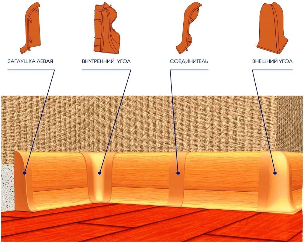 Угловые элементы бывают внутренними и наружными. Первый тип устанавливают на стыках двух фрагментов плинтуса, образующих внутренний угол. Внешние, соответственно — на выступающих краях. Кронштейны применяют для распределения кабелей в углах. Наружные уголки устанавливают не на сами кронштейны, но детали контактируют. Заглушки крепят на открытых краях плинтусов: обычно фрагменты заканчиваются перед наличниками дверей, с запасом в несколько сантиметров. В случае с полнотелыми плинтусами можно обойтись и без заглушек. Соединители используют, если по той или иной причине два отдельных куска сходятся у ровной поверхности. В своем строении они имеют два двухсторонних шипа. В итоге понадобится подсчет всех внешних и внутренних углов и количества дверных проемов. Кому-то будет удобнее собирать конструкцию из многих кусков, другим — вырезать из длинных реек нужные фрагменты.