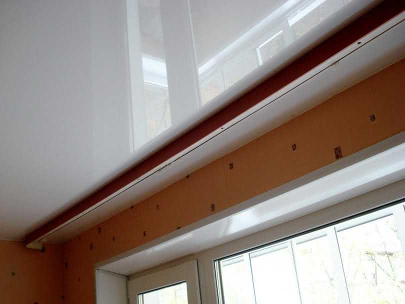 Поверх натягивается потолок и к предполагаемому месту бруса крепится карниз. Если потолок уже натянут, то к перекладине с помощью потайных винтов прикручиваются кронштейны, к которым в дальнейшем крепится карниз.