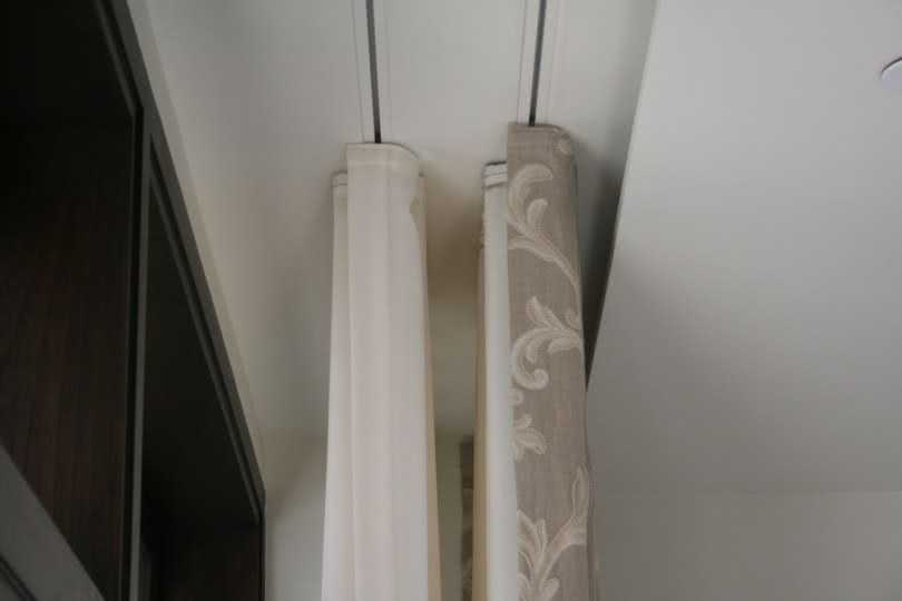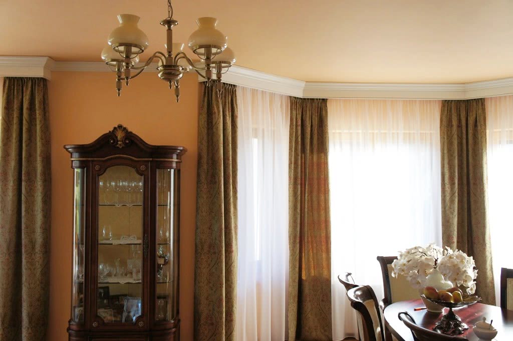 Добротные потолочные карнизы обеспечивают легкое передвижение по ним. Можно рассмотреть вариант исполнения автоматических штор при помощи цепочки с механическим передвижением или дистанционного на пульте управления.