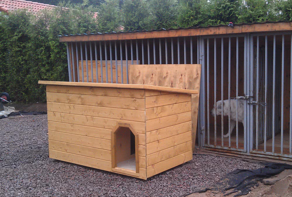 Накрывают крышу битумной черепицей. Снаружи готовая постройка обрабатывается антисептическим средством. Снизу будки крепятся доски, поднимающие конструкцию над землей. Затем оформляется лаз конуры. Можно не только построить будку, но и соорудить полноценный вольер для алабая (как на фото снизу).