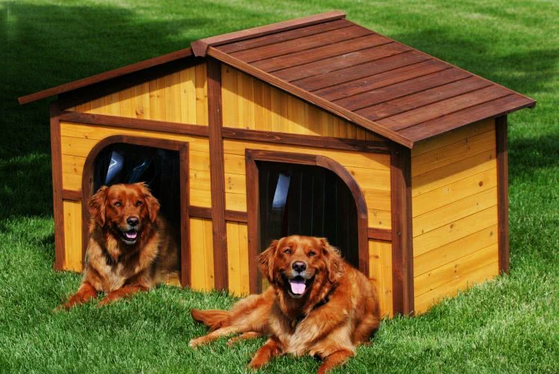 Двойная будка для собак представляет собой продолговатую конструкцию с отдельными входами. Внутреннее пространство разделяют сплошной деревянной перегородкой. К такой конуре можно пристроить общую террасу или тамбур. В целом, устройство будки для двоих такое же, как и для одной собаки.