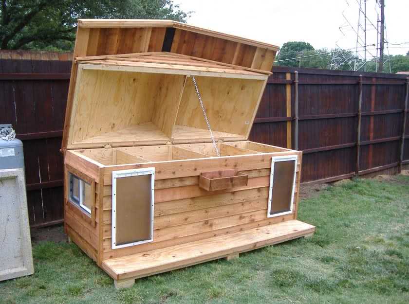 Каркас будки устанавливают таким образом, чтобы крышу над закрытым отделением можно было поднимать для смены подстилки, а также периодической дезинфекции. Лаз во второй отсек располагают под углом ко входу, чтобы создать дополнительное препятствие ветру.