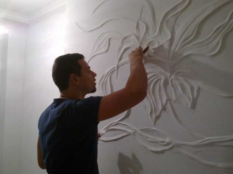 Довольно распространённый вариант. Если стекло или дерево не окрашиваются, то гипсовую отделку можно изменить таким способом. Именно с такими панелями можно создать бесшовное покрытие: стыки просто замазываются гипсом. Но вот для влажных помещений подобная отделка не подойдёт. Точнее, не совсем: есть виды гипсовых панелей, которые (благодаря специальной обработке) не боятся влаги;