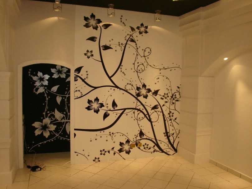 Дорого и эффектно смотрится роспись стен. Наиболее актуальными в этом направлении являются растительные и животные мотивы. Являясь комбинацией фотообоев и трафаретного узора, декор такого варианта позволяет украсить помещение и оставляет полную свободу для творчества. Нанесенный рисунок может быть как монохромным, так и цветным, единичным (на какую-то одну область) или во всю стену. Быть индивидуальным или дополнять иное дизайнерское решение.