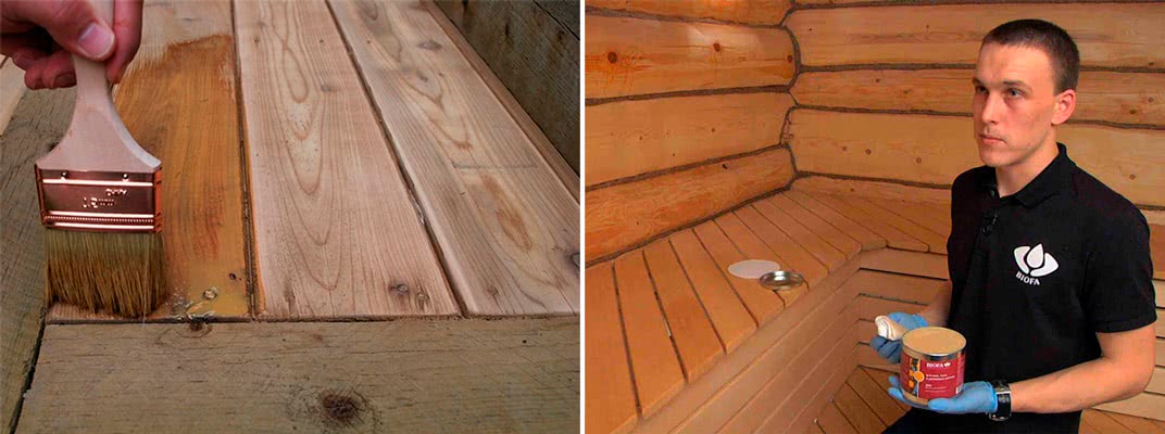 Подобные пропитки отлично подходят для обработки пола в помещениях с повышенным уровнем влажности, поэтому именно их чаще всего используют для покрытия деревянных конструкций в банях.