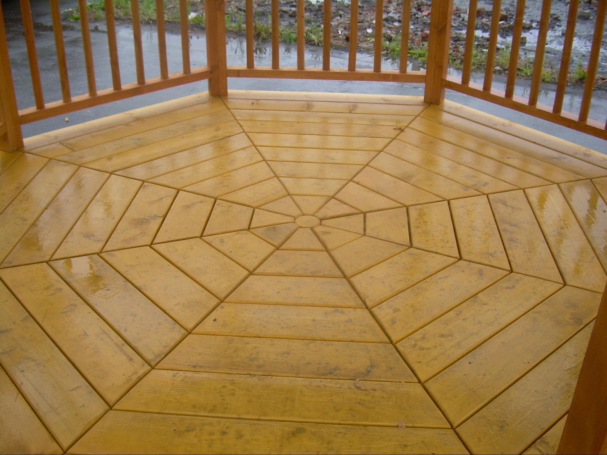 Еще одним нестандартным решением для напольной поверхности в последнее время стало насыпное покрытие. Такой метод чаще используют для открытых беседок на улице.