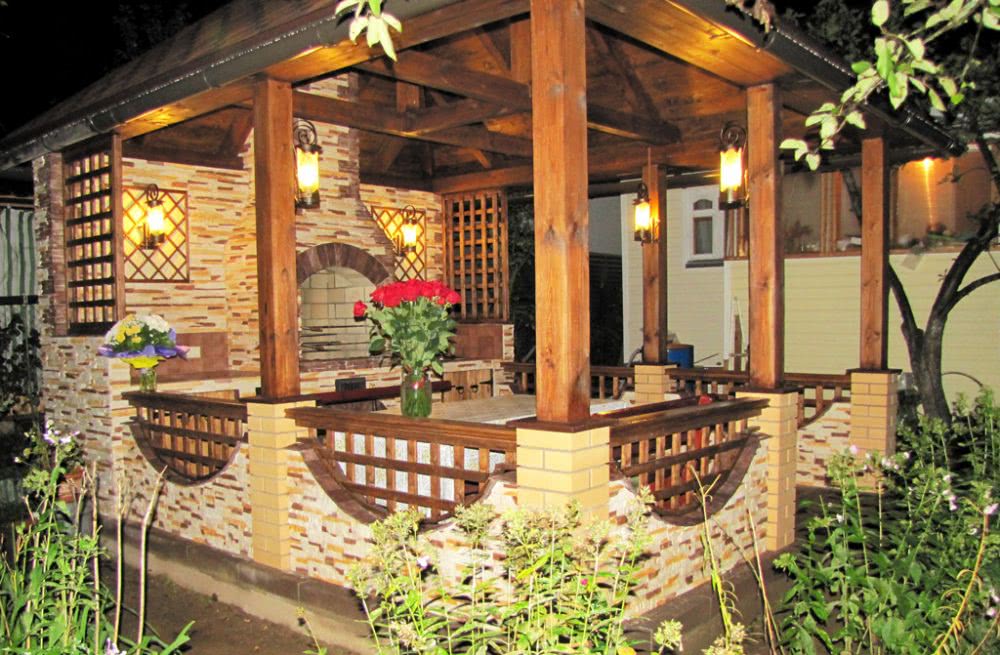 При этом, при всей эстетической оригинальности природного камня, строительный и облицовочный кирпич несомненно является более практичным и позволяет применить большее разнообразие архитектурных и дизайнерских форм. Кирпич можно применить также и для устройства пола беседки. Каменный пол тоже может иметь место, но при этом булыжники должны быть должным образом обработаны.