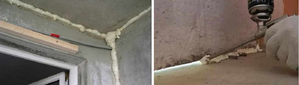 Пену для лучшего сцепления и высыхания наносят на слегка смоченную поверхность с учетом ее сильного расширения после застывания, перед заделкой цементными растворами щели грунтуют.