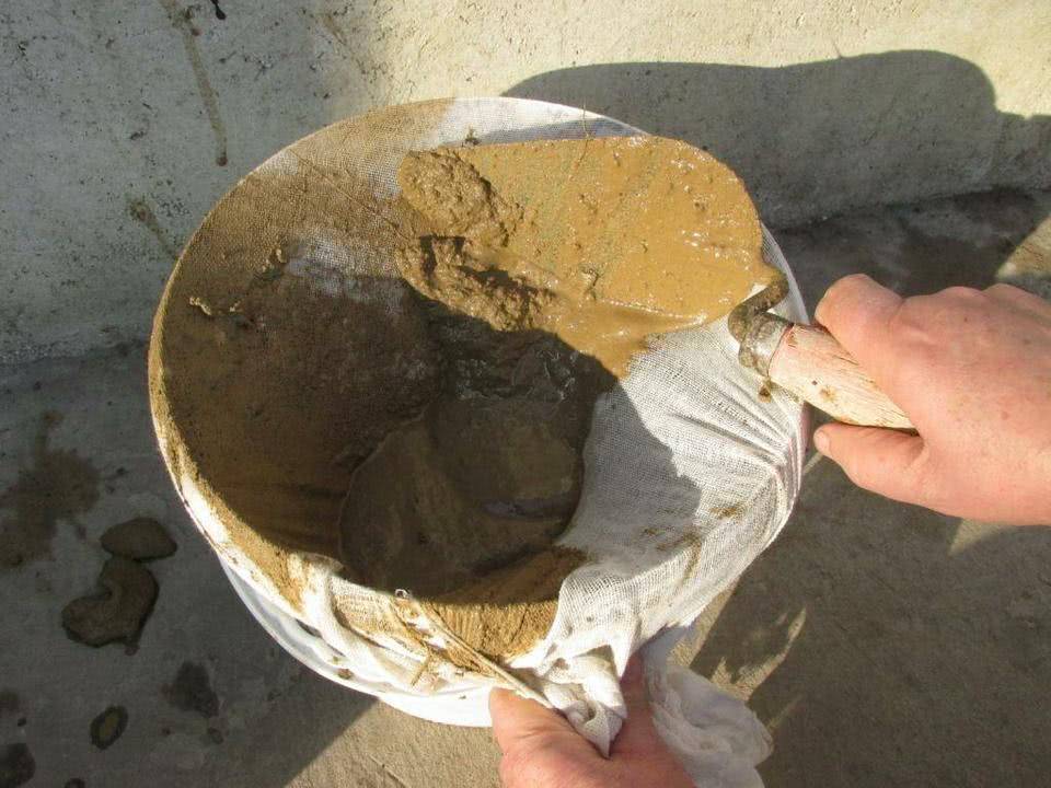 - Тщательно перемешивайте раствор до тех пор, когда к палке не начнут прилипать некоторые сгустки смеси. Если какого-нибудь материала недостаточно, то можно в небольших количествах добавлять его во время перемешивания. Обычно используют 1 часть глины на 2,5 части песка.