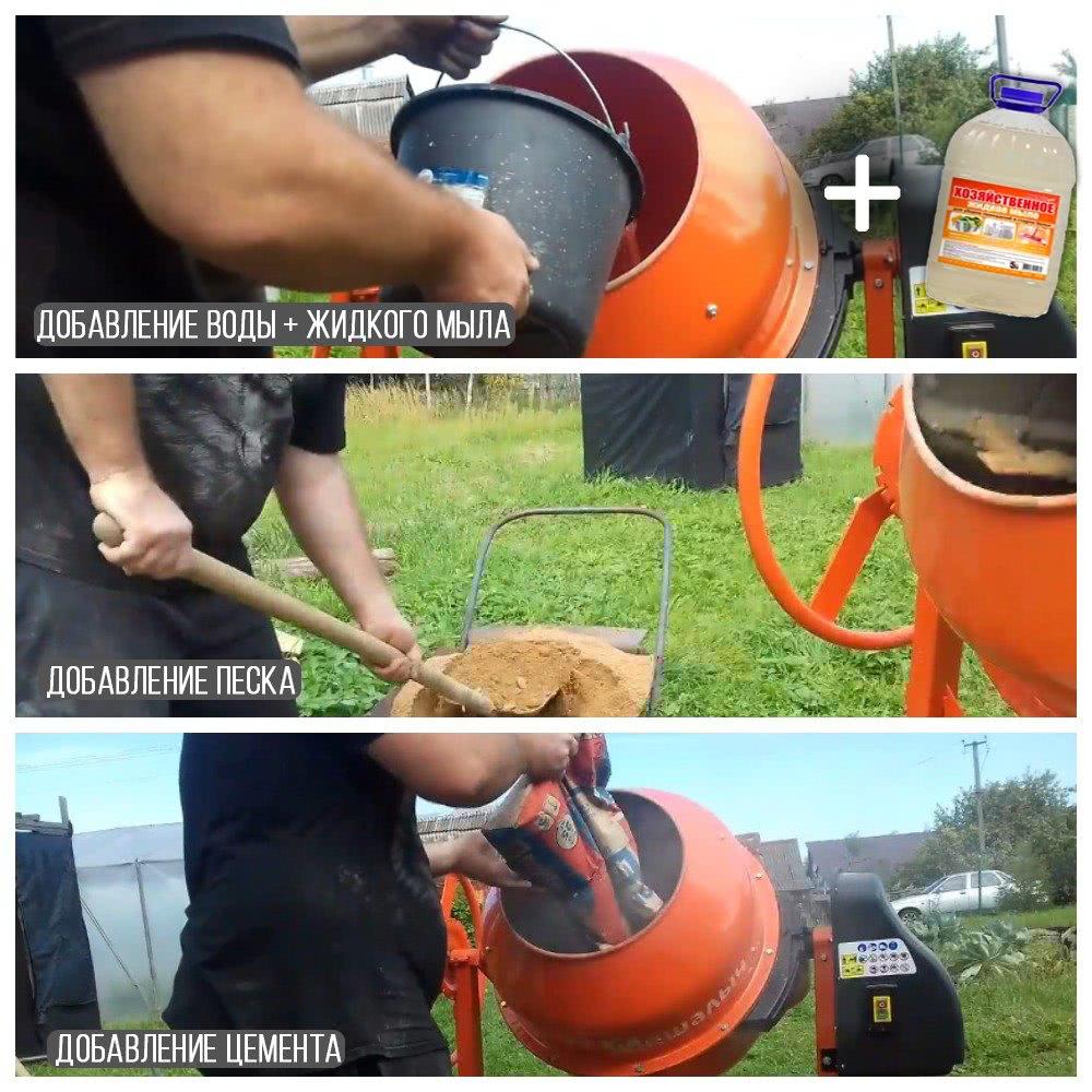 Если раствор готовят в растворомешалке, то во вращающуюся ёмкость вливают большую часть необходимой воды. Затем добавляют жидкое мыло, накидывают лопатой песок. После чего засыпают цемент. Остаток воды добавляют небольшими дозами, следя за консистенцией штукатурного теста. Как только тесто достигнет нужной консистенции, воду подливать прекращают.