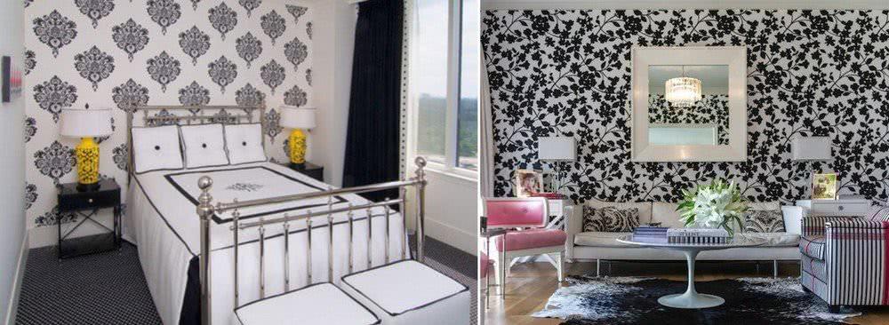 В домашнем убранстве предпочтительно использовать бело черные обои с преобладанием светлого фона и мелкого темного рисунка
