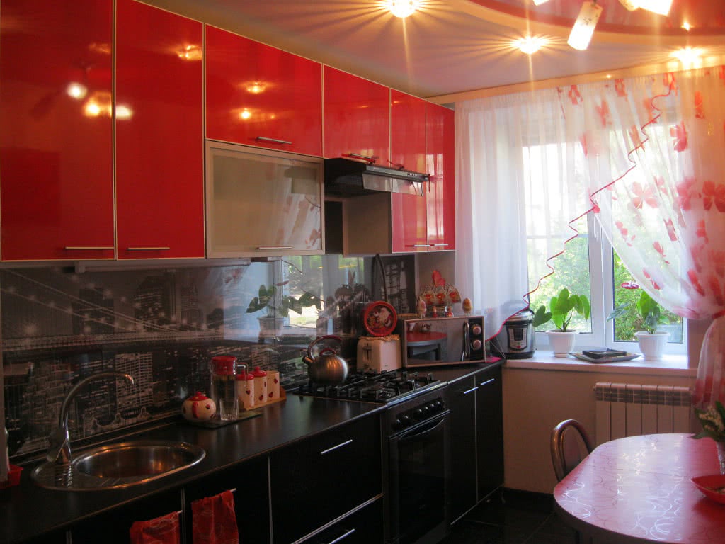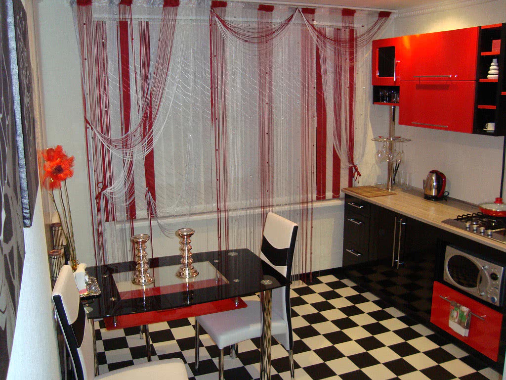 Слишком яркие и агрессивные цвета должны быть немножко сглажены шторами в спокойной светлой гамме. А если тона черно-красной кухни не слишком агрессивные и насыщенные, можно выбрать шторы красного цвета.