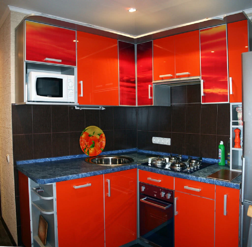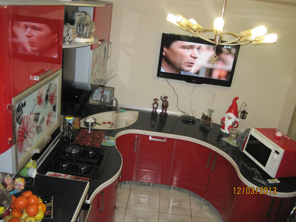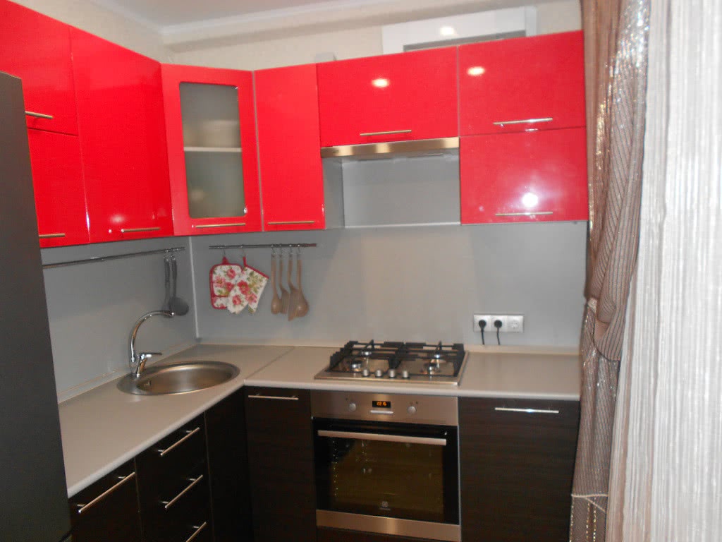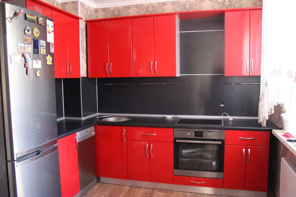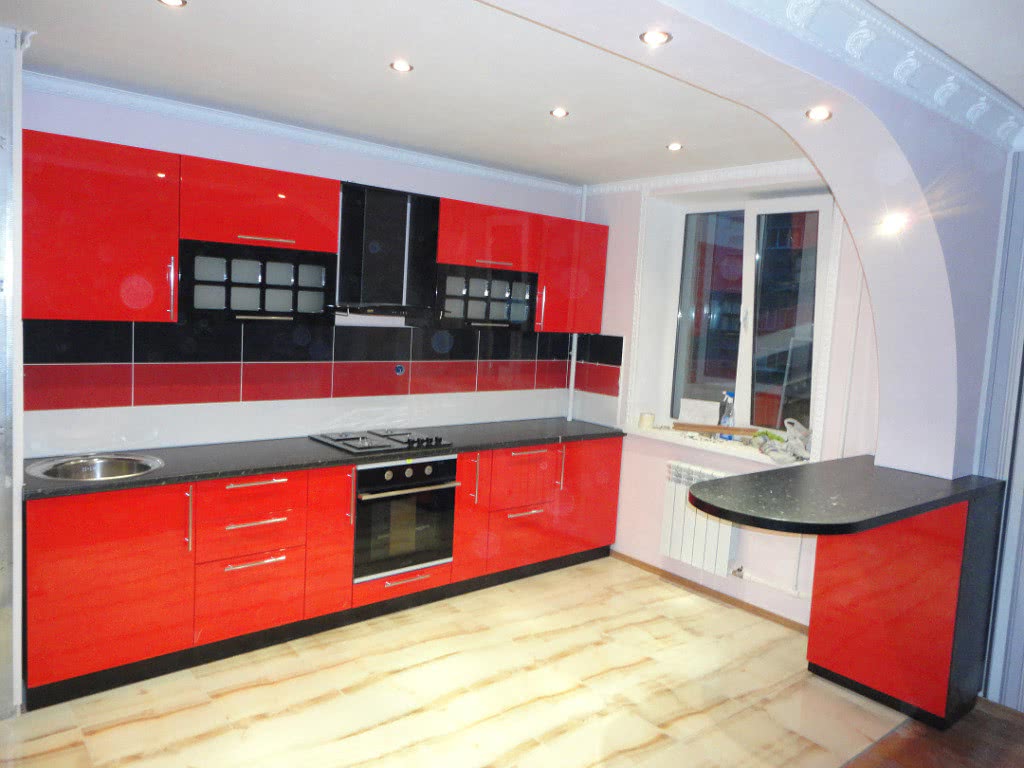 В красно-черных тонах следует сделать фасады гарнитура, а белый оттенок будет служить для них идеальным фоном. Что касается стиля интерьера, то он должен быть современным.
