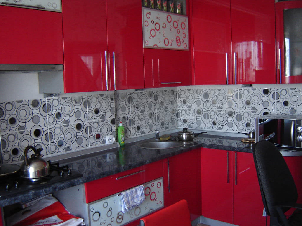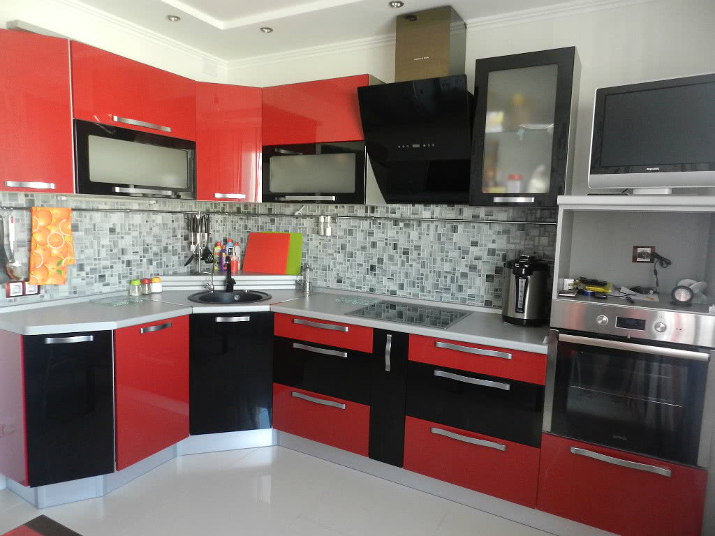 Поверхности фасадов могут быть глянцевыми, в роли аксессуаров выступает металлическая фурнитура и стеклянные элементы. Чтобы гарнитур выглядел более интересно, рекомендуется обустроить кухонный фартук, используя керамическую или стеклянную мозаику в черном, красном и сером цвете. Неплохо будет выглядеть фартук из закаленного стекла с красно-черной фотопечатью.