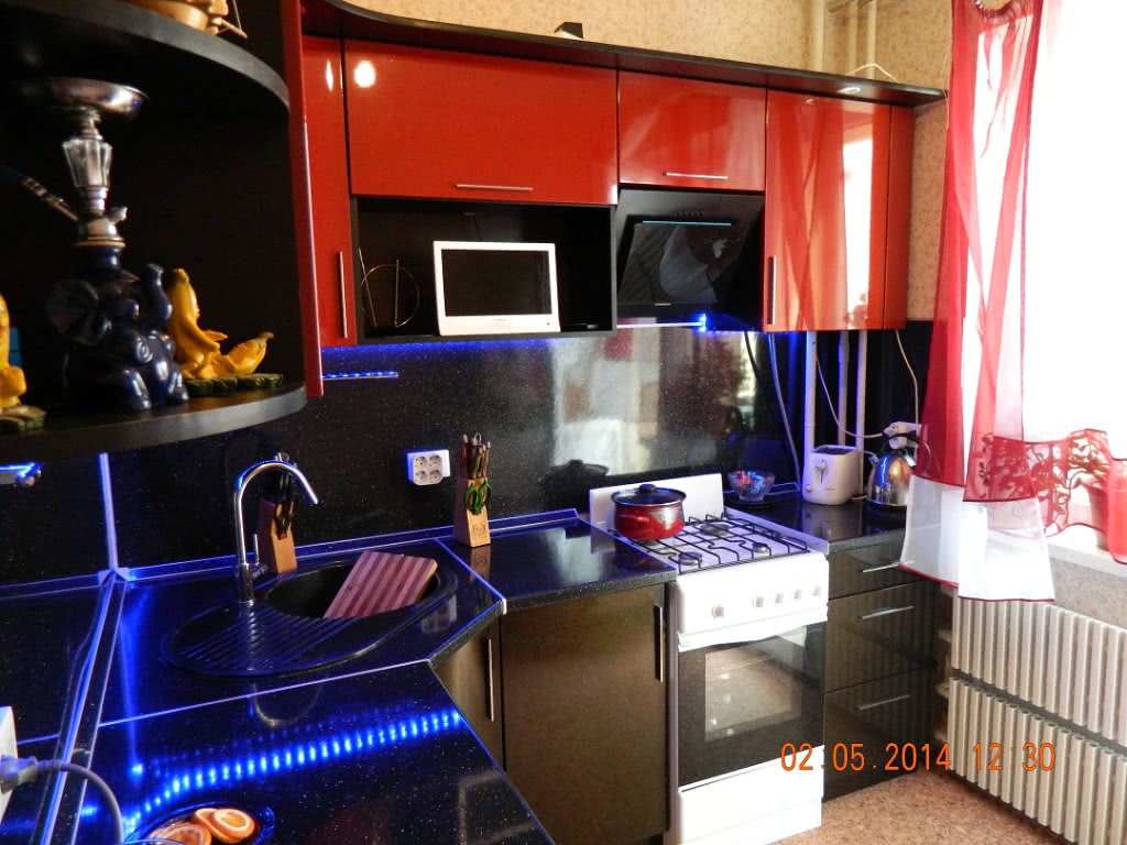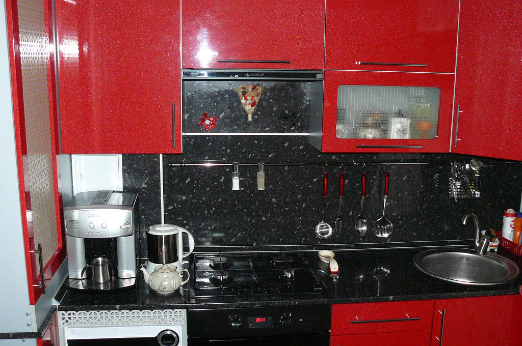 Например, обустроить фартук в черно-синих тонах, повесить на окна синие шторы, расставить на открытых полках декоративную посуду синего цвета.Красно-черный гарнитур необходимо дополнить черным обеденным столом с красными стульями. Стены лучше сделать серыми, пол может быть черным наливным.