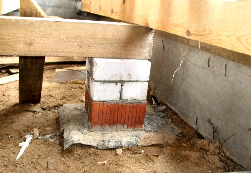 В некоторых случаях опорные столбики устанавливают прямо на грунт. Под опоры выкапывают в земле куб 40х40х40 сантиметров, затем утрамбовывают на дно песок толщиной 10 см, слой щебня толщиной 10 см, и оставшиеся 20 см высоты заливают бетоном. После застывания формируют опору из кирпича на необходимую высоту и укладывают гидроизоляцию (например, рубероид).