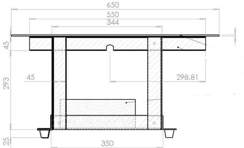 Верхнюю часть металлической станины удобнее всего изготовить в виде прямоугольной рамы 600 на 400мм, сваренной из уголков на 25мм. К четырём углам этой конструкции привариваются трубные заготовки длиной 220 мм (рекомендуемый диаметр труб – 17-20 мм).