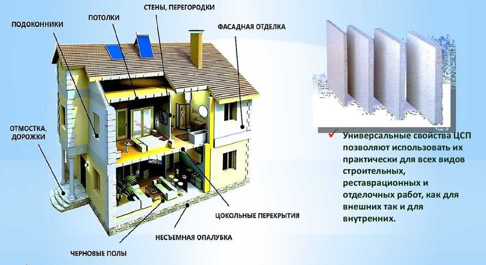 Область применения плит ЦСП — стены, потолок, пол, опалубка