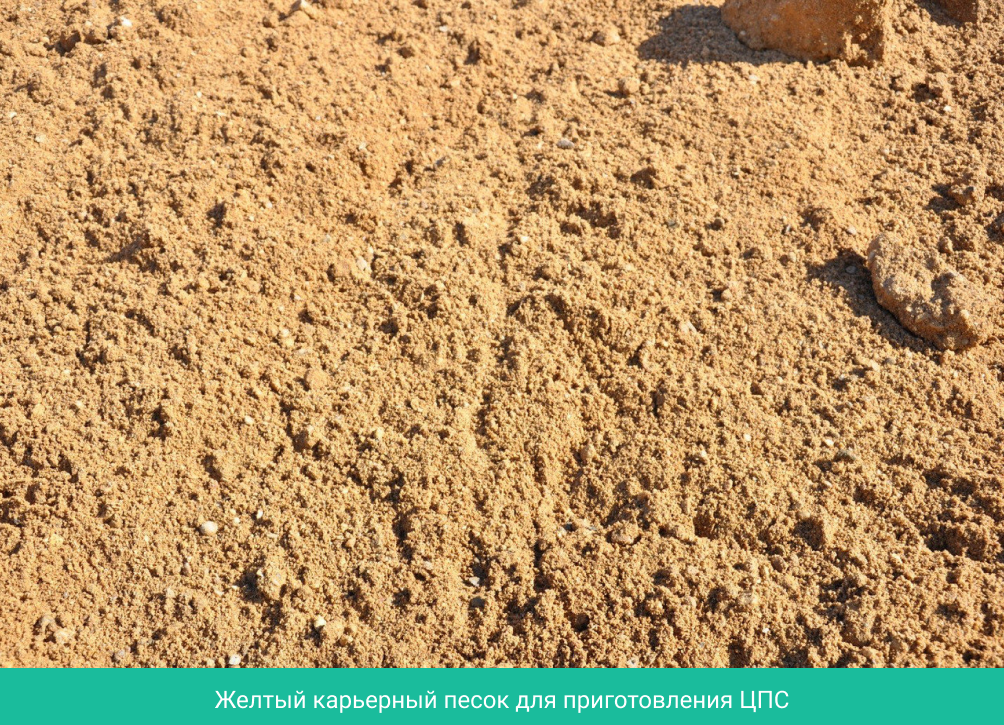 Чтобы приготовить ЦПС, рекомендуется брать желтый карьерный или речной песок со средними размерами фракции в пределах 20-40 мкм. Чем крупнее фракция песка, тем лучше более жесткой будет смесь и выше ее сцепление со стеной. Слишком мелкую фракцию лучше не использовать, поскольку она может сделать смесь чересчур пластичной, из-за чего нанесенный слой будет оплывать.