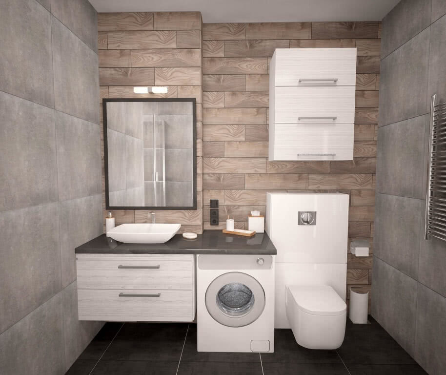 При сочетании серого с другими тонами отделка будет практичной. В этом случае практически не заметны брызги воды и пятна.