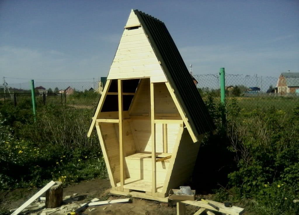 - При постройке кабинки типа «Скворечник» передняя часть кровли выше задней. Это необходимо для того, чтобы сток дождевой или талой воды происходил за строением.