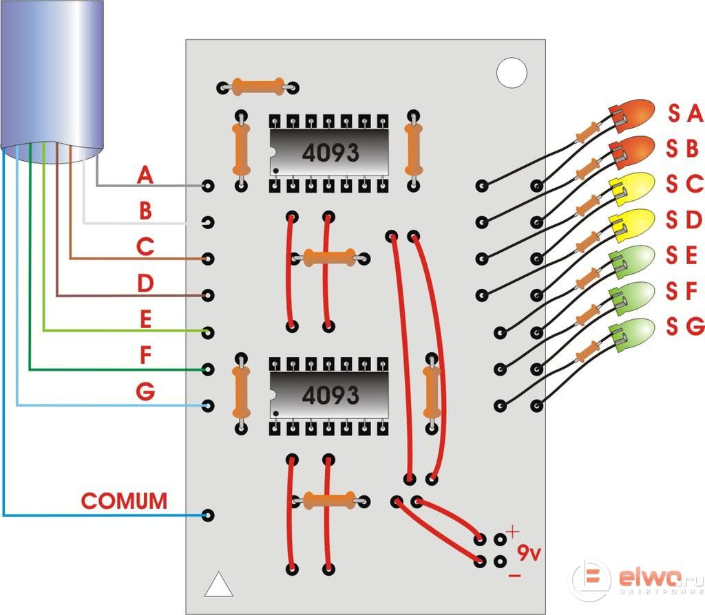 Итак, основа — это CI4093, что имеет четыре элемента. В этом проекте использовано две микросхемы. Тут мы имеем порты с одним входом на высоком уровне, а другие подключенные через резистор, обеспечивая высокий логический уровень. При помещении в эту логику нулевого входного сигнала, выход инвертора будет на высоком уровне и включает светодиод. Всего использовано семь из восьми элементов, из-за ограничений в кабельной сети.