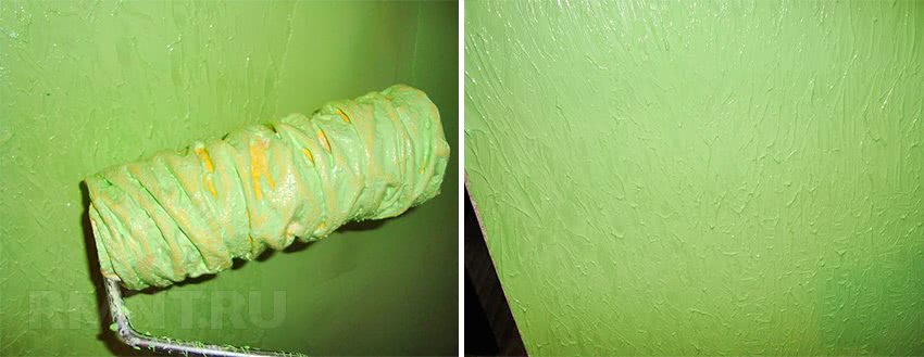 4. При помощи валика. Для достижения неровностей на поверхности штукатурки, намотайте на валик ткань и проводите им по невысохшей стене с достаточным давлением. Чем больше вы будете надавливать на инструмент, тем глубже и ярче будет выражен рельеф штукатурки.