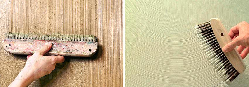 2. Технология «щётки», превращающая традиционную штукатурку в декоративную. Ваша задача состоит в том, чтобы оставить щёткой углубления ещё до полного высыхания материала. Обрабатывать стену можно прямыми, полукруговыми и круговыми движениями щёткой. Размер и протяжённость углублений вы можете изменять самостоятельно, используя для этого разную силу надавливания и амплитуду работы рукой. После того как ваша декоративная «штукатурка» высохнет, вы можете её покрасить.