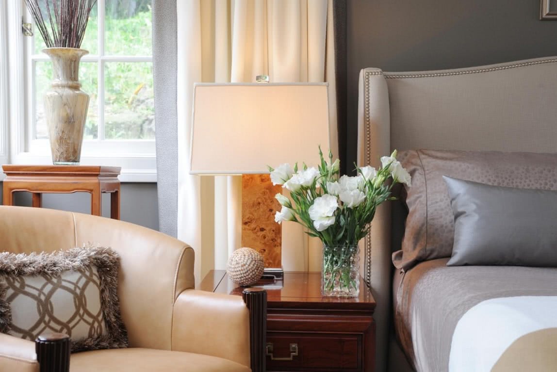 - Спальня. Прикроватная тумба, стена над кроватью, комод, свободное пространство у стенки шкафа.