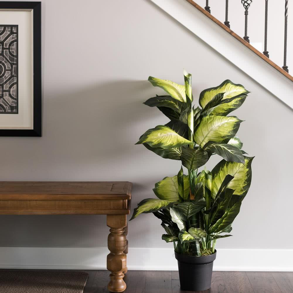 Комнатное растение диффенбахия-это особый сорт со светло-лимонными зелеными листьями, которые выглядят так, будто их забрызгали темно-зеленой краской. Они добавляют великолепную современную арт-подобную текстуру к белой мебели, изящно взрываясь на заднем плане.