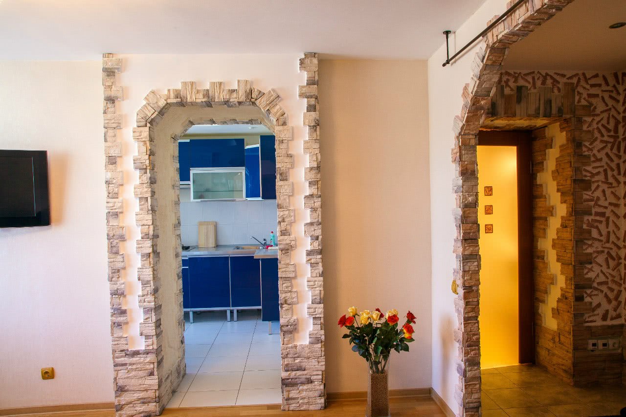 Часто для визуального расширения кухни и прихожей отделку дверного проёма между помещениями выполняют декоративным камнем. При этом необходимо придерживаться одного цвета и стиля, поскольку сочленение разных стилей дизайна не всегда обеспечит хороший результат.