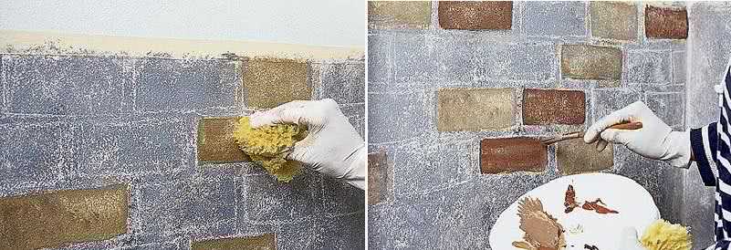 В последнее время модной стала белая кирпичная стена. Если вы собираетесь делать именно такую, проблем нет: кистью швы, поверхность — валиком. Если хотите иметь не слишком однотонную, к базовому красящему составу добавьте немного оттеночной — серой, коричневой, желтой… да хоть розовой или голубой. Этой краской покрасьте. В остаток добавьте больше белой и этим, более светлым составом добавьте бликов при помощи полусухого валика, губки, кисти. При желании можно верхние «тени» нанести с серебром, бронзой, добавив немного золота. Тут уже как вам больше понравится.