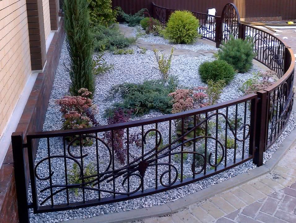 Лучше всего кованые изделия смотрятся на фоне каменных или кирпичных дорожек, альпийских горок и декоративных фонтанов. Железные декоративные заборчики чаще всего устанавливаются стационарно. Для этого столбики ограждения бетонируются, чтобы ограда не деформировалась в будущем. При этом основной каркас должен находиться на высоте 2 см над грунтом. Для монтажа высокого металлического забора, необходимо возводить фундамент.