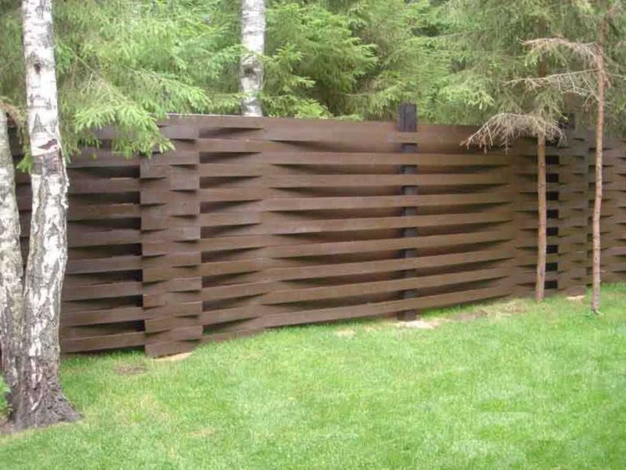 Достоинства у такого забора из дерева два: красивый и необычный внешний вид и удобство в применении для внешней изгороди. С одной стороны, он получается сплошным для взгляда и полностью закрывает обзор. С другой стороны, благодаря воздушным зазорам изгородь имеет меньшую парусность, при установке ее на месте с сильными ветрами это может быть существенно. Недостаток в этом ограждении один – сложность монтажа.