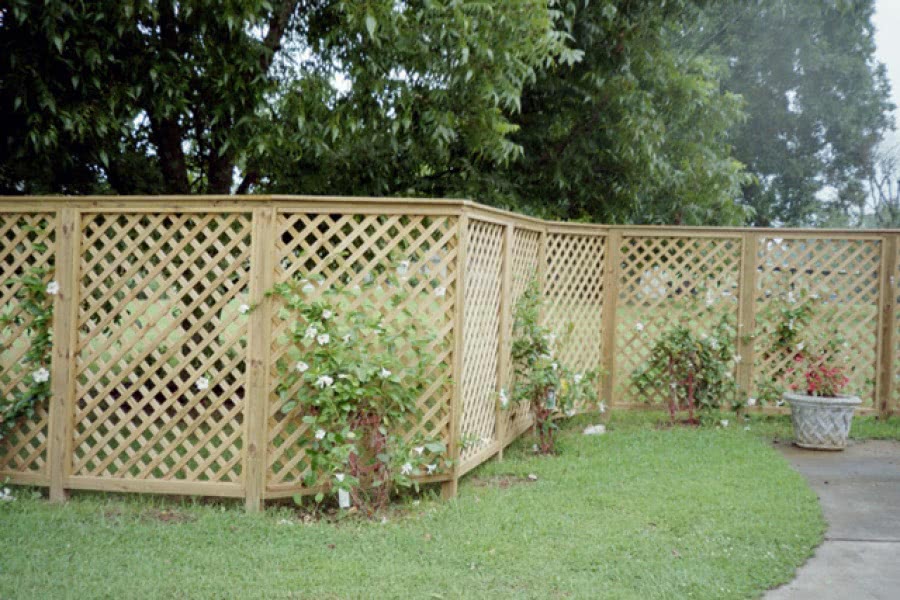 - Решетку. Планки набиваются друг на друга с равномерным шагом под углом. Красивая ограда. Ее дополняют вьющимися растениями, высаженными по периметру.