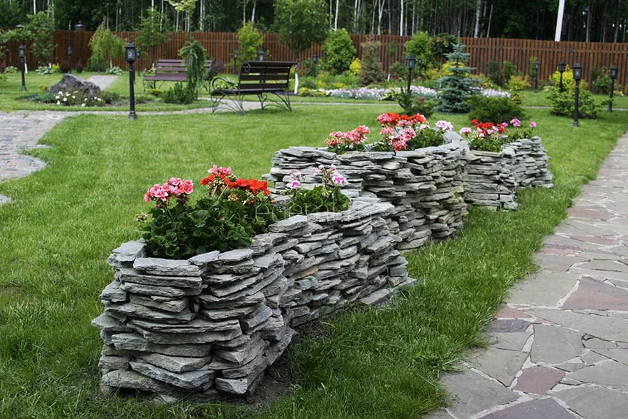 Это может быть декоративный камень или обломки правильной формы от строительных конструкций. Камни укладываются в один-два ряда. Все зависит от требуемой высоты. Для этого подготавливается траншея по намеченному контуру