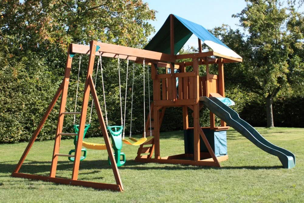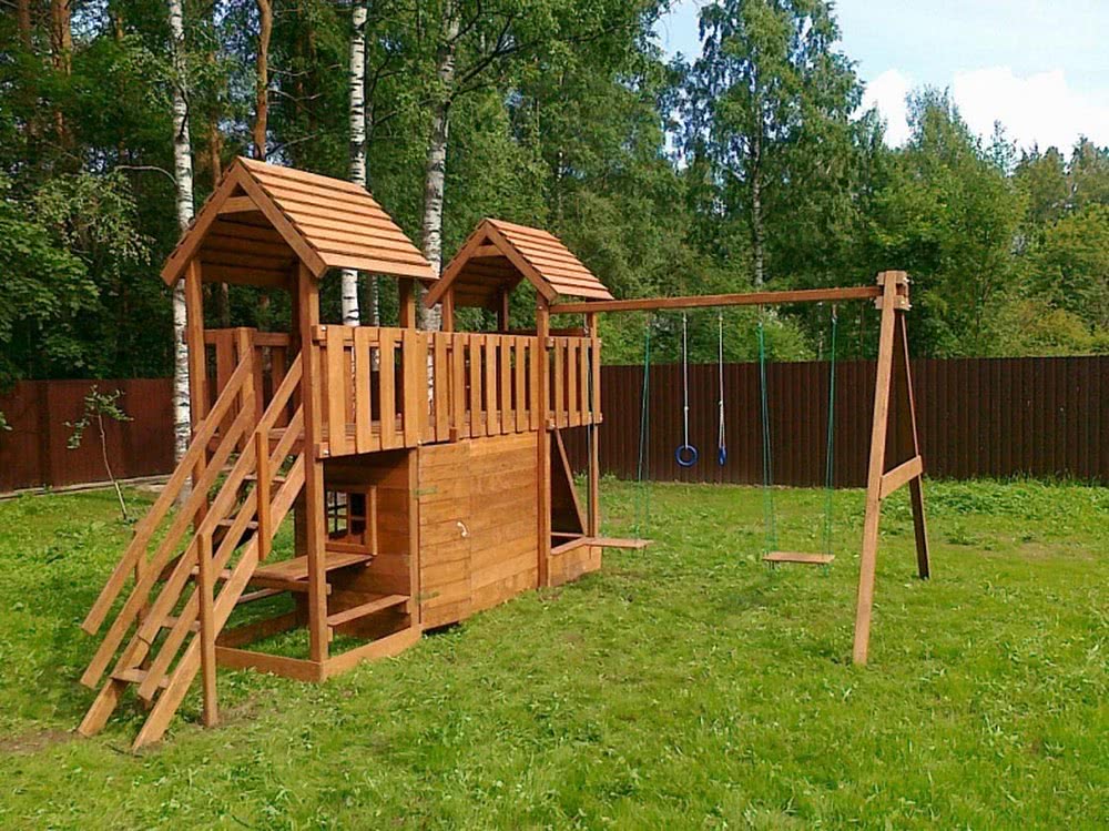 • Деревянный игровой комплекс с пластиковой горкой, качелями на цепях и гимнастическими кольцами. Добраться до горки можно забравшись по деревянным перекладинам или же преодолев наклонную доску с упорами, а затем перебравшись на руках по гимнастическим кольцам.