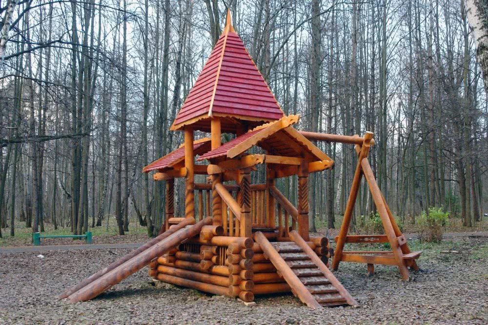 • Детская площадка в «бревенчатом» стиле имеет множество уголков, где можно спрятаться на нижнем ярусе. Наверху расположены разноуровневые площадки, на которые забираться надо по лестнице с набитыми планками. Спуститься можно по горке.
